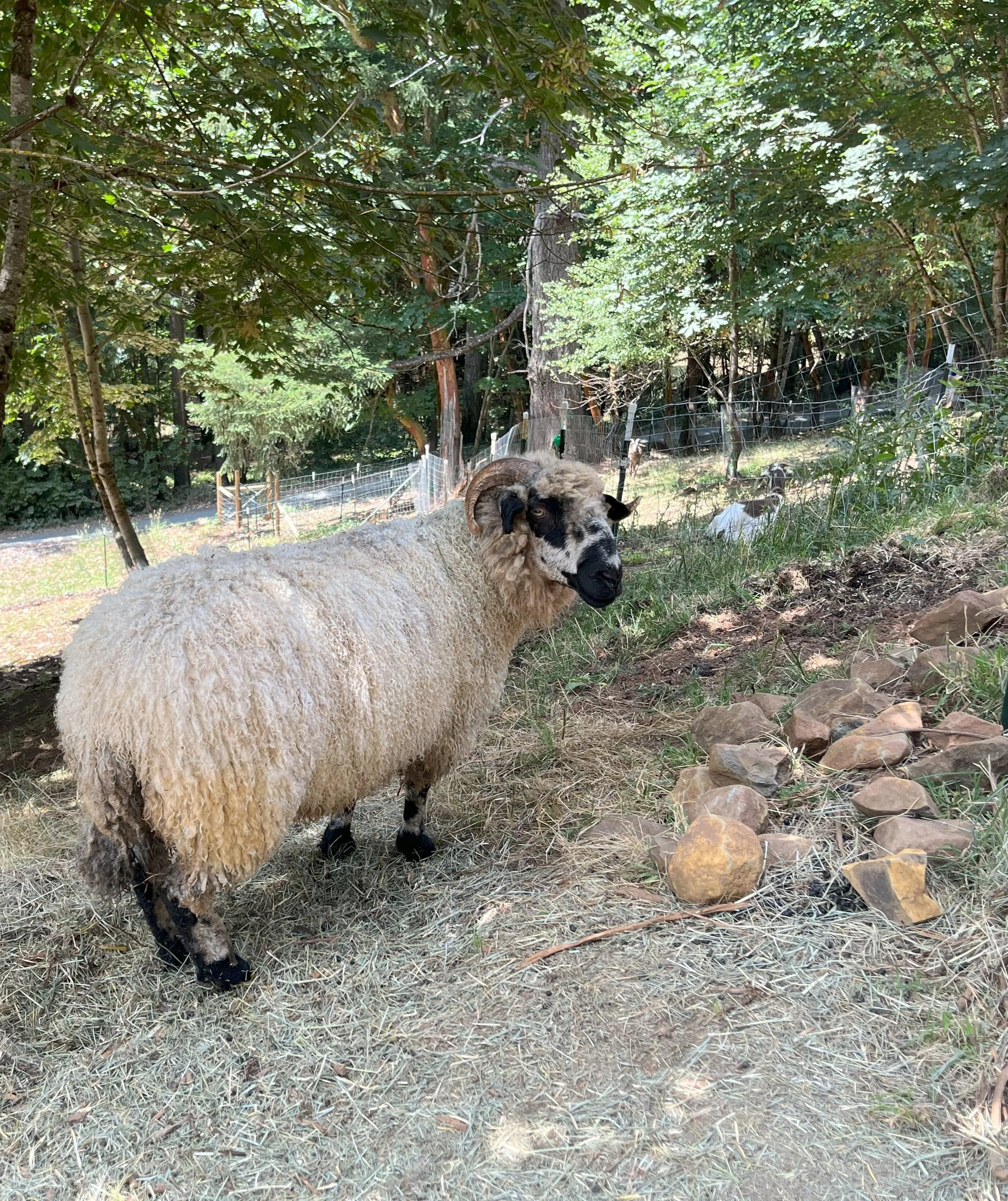 We purchased our first ewes from Shepherd’s Lane in Oregon, Clara, an F1 (1/2 Teeswater and 1/2 Valais), Woolma, a foundation ewe with a mysterious past that makes us suspicious she has more Valais in her, and her Spitti lamb, Noodle, another F1. We will be breeding Clara and Woolma in the Fall of 2025 with 100% purebred Valais Rams, and Noodle in the Fall of 2026.